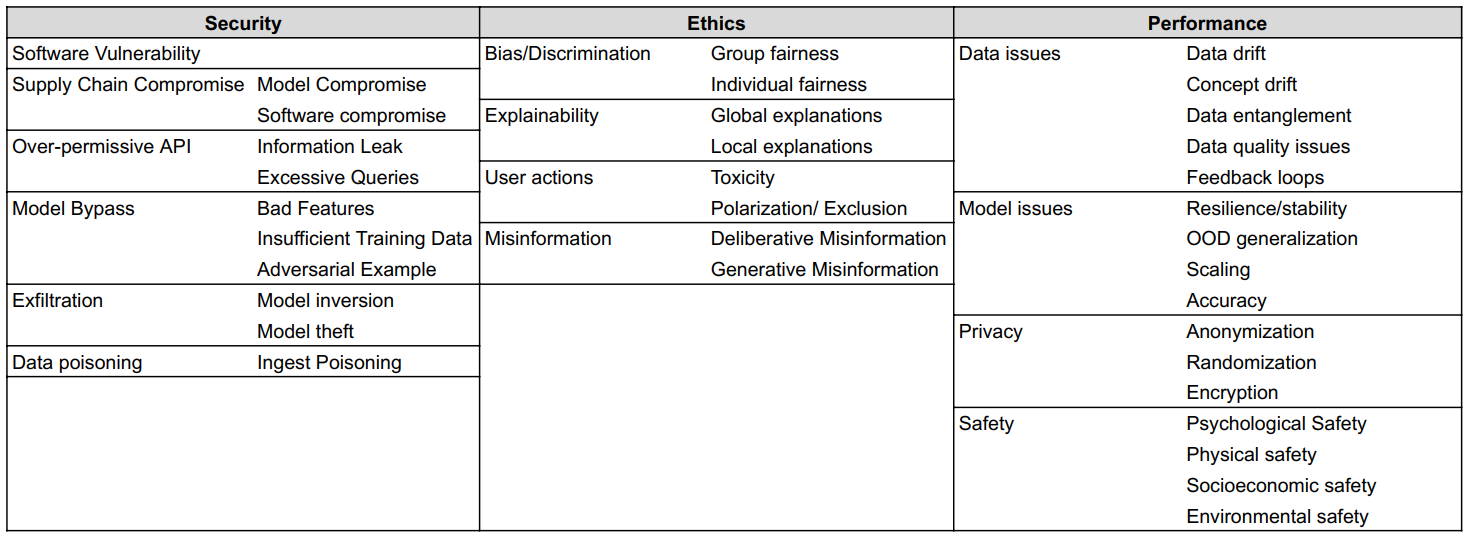The domains, categories, and subcategories in this view provide a โrisk surfaceโ for the AI artifact being evaluated, may it be a dataset, model, or the whole system. This view contains three top-level domains: